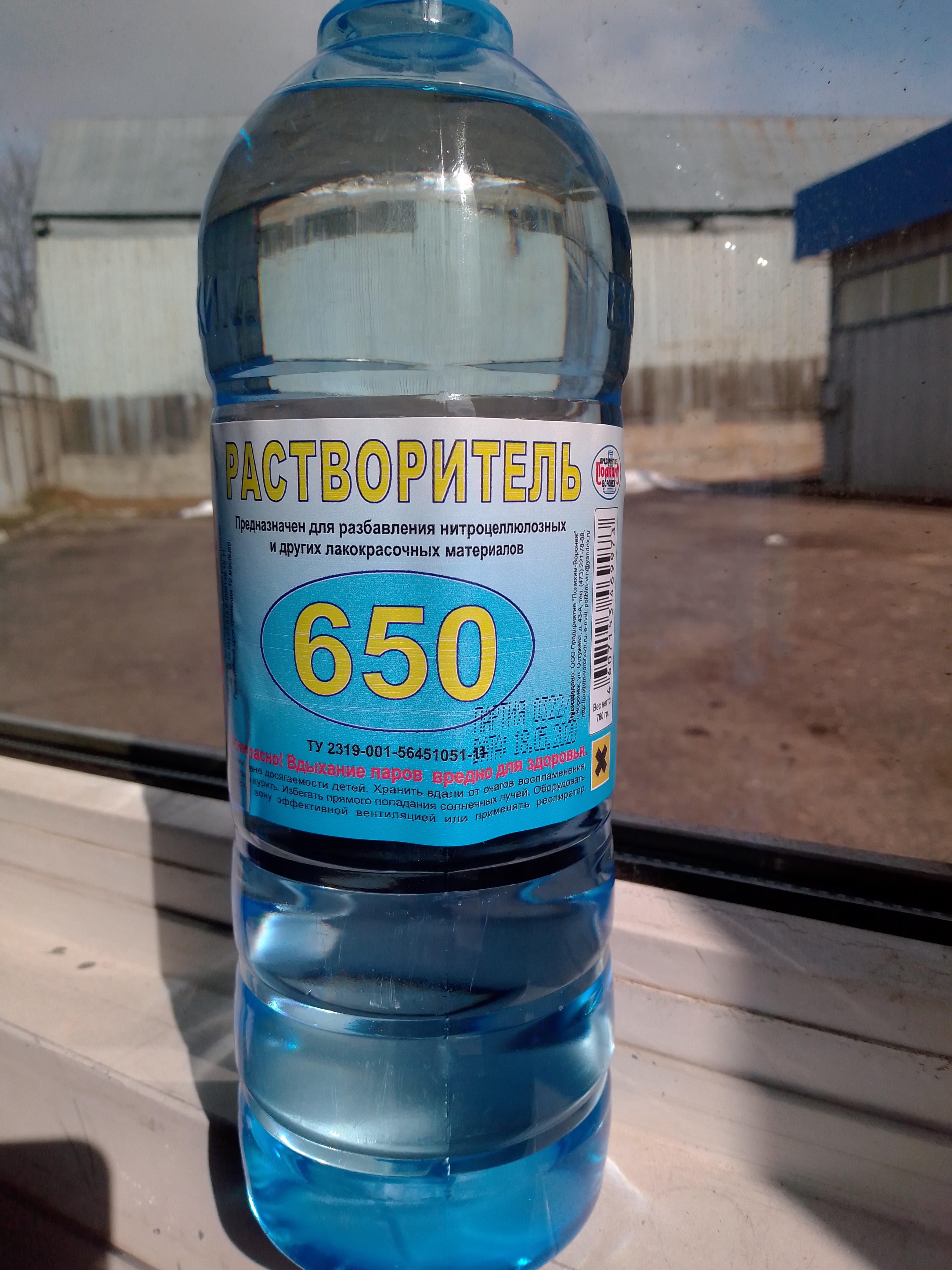 Растворитель 650 1л DETON - прозрачная, слегка желтоватая однородная прозрачная жидкость. После высыхания не оставляет следов и пленки на поверхности.