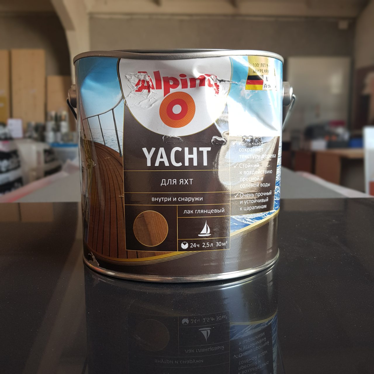 Лак алкидн. Alpina яхтный (Alpina Yacht) глянцевый 2,5 л. Лак уретано-алкидный водооталкивающий, глянцевый прозрачный, для лодок и подвергаемых особо сильной нагрузке деревянных поверхностей.