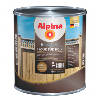 Альпина АКВА Лазурь для дерева (Alpina AQUA Lasur fur Holz, Holzlasur) – тонкослойная водоразбавляемая лазурь для дерева, прекрасно сохраняет текстуру, отлично защищает от атмосферных воздействий и влаги внутри и снаружи помещений. Обеспечивает длительный срок службы деревянных поверхностей.