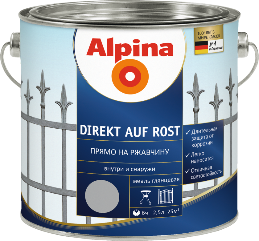 Антикоррозионная эмаль для защиты железа и стали. Антикоррозионная эмаль Прямо на ржавчину содержит 3 покрытия: защита от коррозии, грунтовка и финишное покрытие. Альпина Прямо на ржавчину молотковый эффект может наноситься на чистое и поржавевшее железо и не оцинкованную сталь, возможно нанесение эмали на старые покрытия (за исключением акриловых лаков).