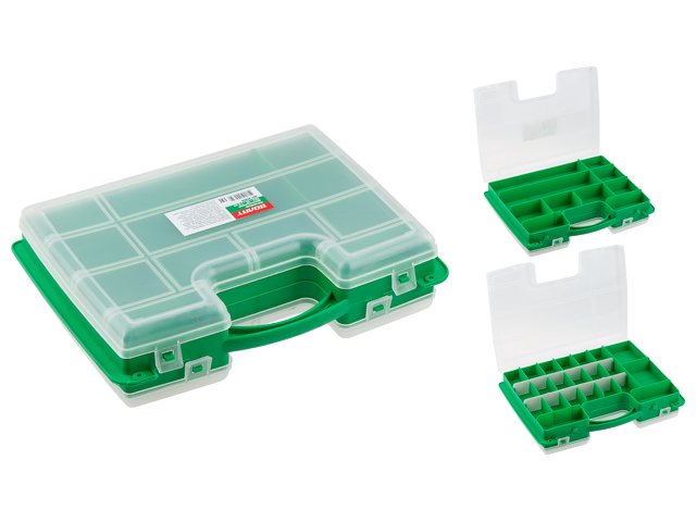 Пластиковый двухсторонний ящик выполнен в форме кейса, переставные перегородки, на одной стороне 22 отделения, на другой - 10 отделений. Служит для хранения и переноски крепежных и других мелких изделий. В нем удобно размещаются необходимые аксессуары и различные мелочи. Прозрачная крышка позволяет видеть расположение крепежа внутри.