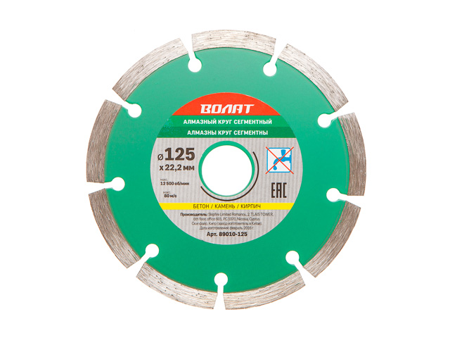 Технические характеристики: Тип: алмазный круг сегментный для сухой резки асфальтового полотна, бетона, гранита, кирпича, камня и других твердых материалов. Высокая скорость резания, точная резка. Сухой рез. Диаметр, мм.: 125. Посадка, мм.: 22.2. Оборотов в минуту (RPM): 12 500. Максимальная окружная скорость, м/с: 80. Толщина реза, мм.: 2.2. Количество в упаковке, шт.: 1. Упаковка: индивидуальная картонная упаковка с отверстием под крюк. Сертификат: декларация о соответствии ЕАЭС № BY/112 11.01. ТР010 003 22023