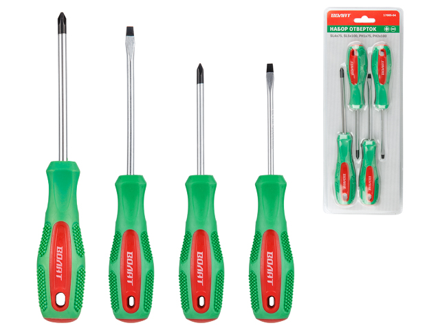 Набор отверток 4 предмета ВОЛАТ (17085-04) используется для монтажа и демонтажа резьбовых соединений. В состав набора входят крестовые и шлицевые отвертки SL4х75, SL5х100, PH1х75, PH2х100