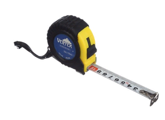 Рулетка предназначена для измерений линейных размеров. Корпус изготовлен из пластика покрыт резиной, лента изготовлена из инструментальной стали. На рулетке есть шнурок и металлическая скоба для крепления на руку или на пояс.