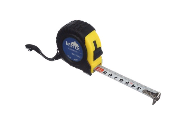 Рулетка предназначена для измерений линейных размеров. Корпус изготовлен из пластика покрыт резиной, лента изготовлена из инструментальной стали. На рулетке есть шнурок и металлическая скоба для крепления на руку или на пояс.