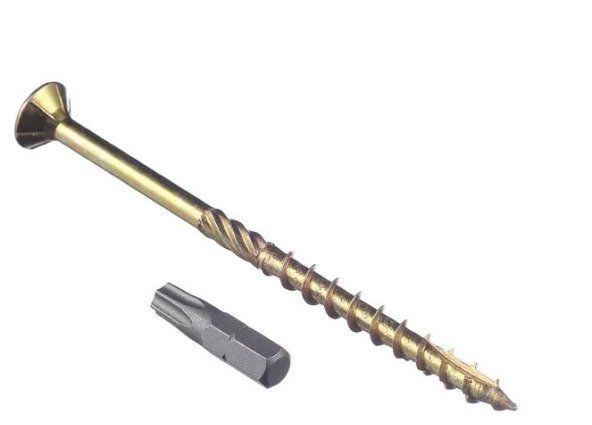 Шуруп для деревянных конструкций с плоской потайной головкой с насечками для раззенковки и ребрами, шлиц под биту TORX 20, тип 17, покрытие жёлтый цинк.